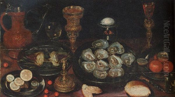 A Laid Table With Salvers Of Oysters, Artichokes, Oranges And Lemons, With Jug, Roemer, Silver Gilt Cup, Salt Cellar And A Wine Glass And A Loaf
