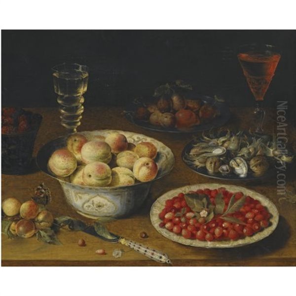 A Still Life With Peaches, Fraises De Bois, Mulberries And Plums, Together With A Plate Of Hazelnuts And Walnuts, A Knife And Two Wine Glasses On A Wooden Tabletop
