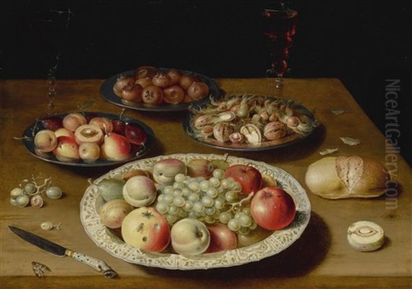 Still Life On A Plain Wooden Table: A Large Wan-li Porcelain Dish Of Fruit, A Pewter Dish Of Fruit, Medlars And Nuts, A Moth, Two Venetian-style Glasses Of Wine, One White And The Other Red, A Knife With An Ornamental Handle, White Grapes, A Roll Of Bread