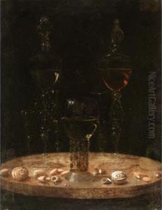 Still Life Of A Roemer With Five Wine Glasses Upon A Table Top