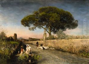 Campagnalandschaft Mit Der Via Appia, Ein Von Ochsen Gezogenes Fuhrwerk Und Ein Bauer Auf Dem Weg Zum Markt Neben Einem Ruinosen Bauwerk