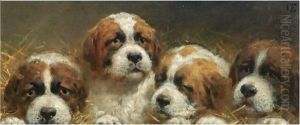 Four Curious Saint Bernards Puppies Oil Painting by Otto Eerelman