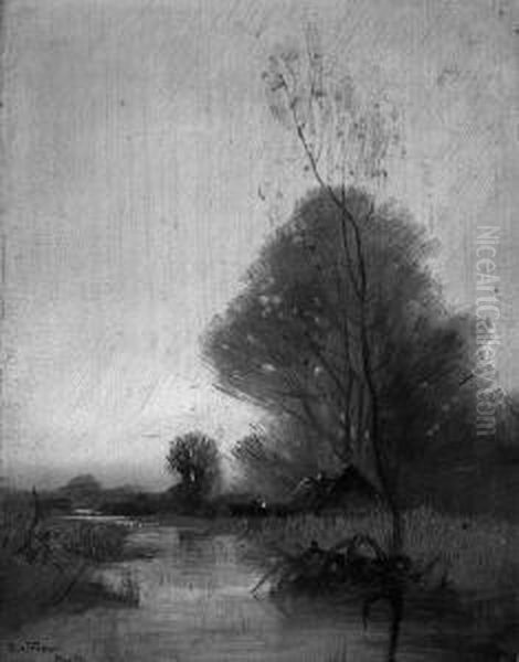 "moorlandschaft Im Abendlicht". Sign., Bez. Munchen Und Dat. 96. Ol Auf Holz. 18 X 14 Cm. Rahmen