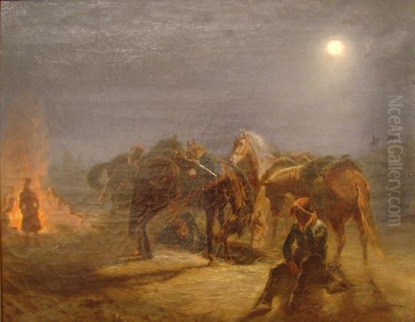 Nachtliche Reiterrast Am Feuer