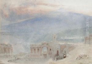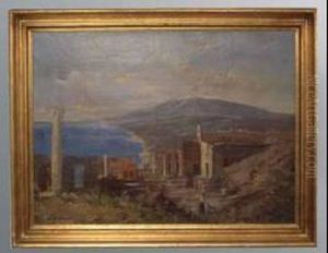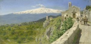 Taormina. Blick Uber Die Ruinenstadt Im Morgenlicht. Im Hintergrund Der Schneebedeckte Atna Oil Painting by Otto Geleng