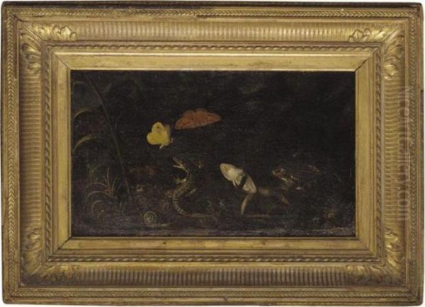 A Forest Floor With Frogs, A Lizard, A Snail And Butterflies