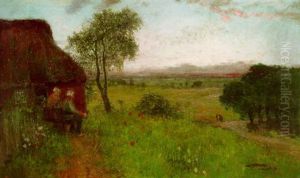 Sturmischer Sommertag Mit Worpsweder Kirche - Auf Dem Weg Bergan Eine Bauerin Mit Kleinem Madchen