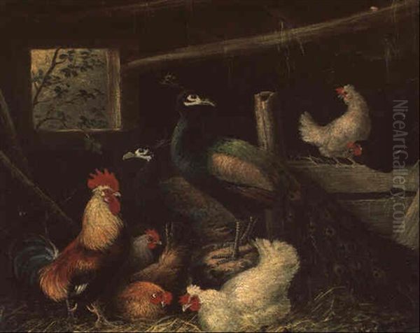 Huhnerhof Mit Pfau Oil Painting by Otto Scheuerer