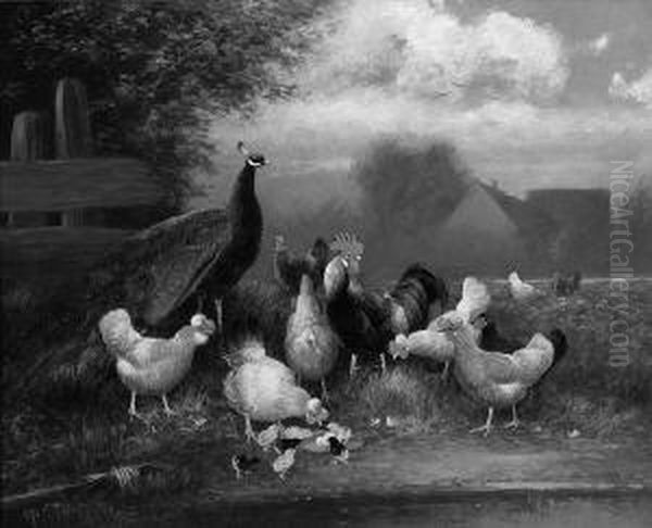 "huhnerhof". Sign. Und Bez. Munchen. Ol Auf Karton. 32 X 39,5 Cm. Rahmen