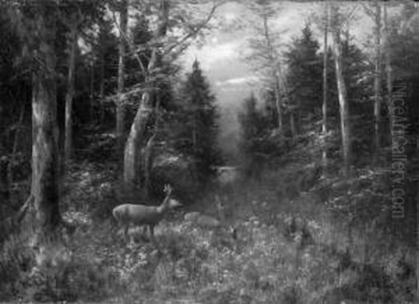 "rehe Auf Einer Waldlichtung". Sign. Und Bez. Munchen. Ol Auf Lwd. Rest. 50,5 X 70 Cm. Rahmen
