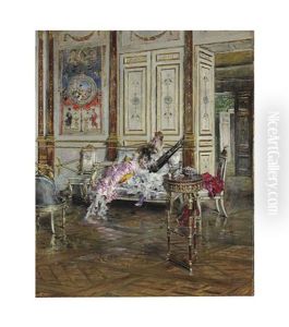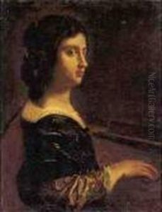 Portrait Of A Lady, Half-length, In A Lavender And White Dress, Playing A Lyre