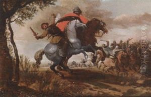 A Wooded Landscape With Travellers In A Wagon Being Ambushed