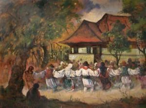 "the Round Dance", Signed At Bottom Right In Black, Oil On Cardboard, 54x7cm