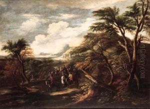 A Cavalry Troop In A Wooded Landscape, A Town Beyond