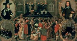 Tome 4 fol.19 View of Plaza de Thalco with an Indian tied to a stake, from Teatro de la Nueva Espana, 1640