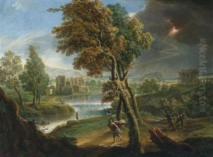 An Extensive Landscape With A Hunter, Drovers And Other Figures On A Track (+ A River Landscape With Anglers On A Bank; Pair)