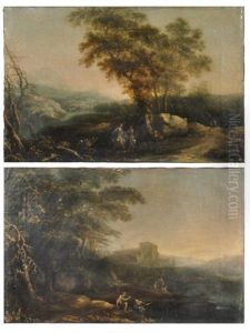 A Wooded Landscape With A Muleteer And A Cattle Drover (+ A River Landscape With Shepherds On The Riverbank; Pair)
