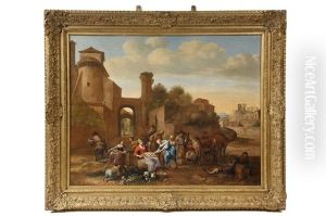 A Woman Buying A Kid Goat From A Shepherd, With A Boy Sitting On A Saddle And A Man Smoking A Pipe, By A Ruin
