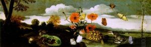 Natura Morta Con Fiori, Farfalle, Tartaruga, Granchio E Lucertola In Un Paesaggio