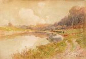 Paesaggio Lacustre Con Cane, Oliosu Tela. F.to In Basso A Destra. In Cornice