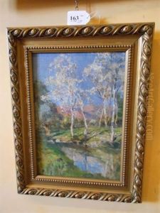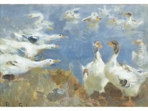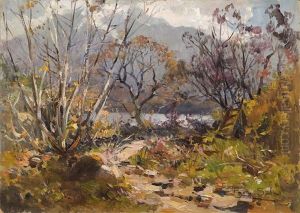Paesaggio Con Galline E Veduta Lacustre Sullo Sfondo