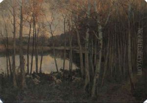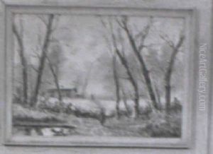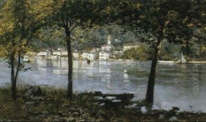 An Estuary Scene With Figures By A Boat In The Foreground And Shipping Beyond