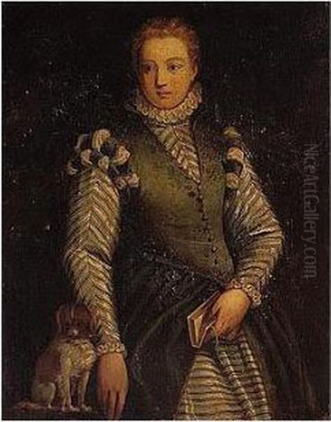 Portrait Of A Lady, Wearing A Green Dress, Holding A Book, Together With Her Pet Dog
