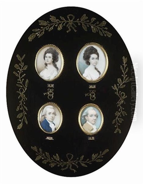 A Lady, Wearing Pale Pink Dress With Lace Neckline, Her Dark Hair Upswept And Over Her Shoulder (+ 3 Others; 4 Works, Framed Together)