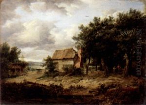 A Landscape With A Boy Fishing And Other Figures On The Banks With A House Beyond