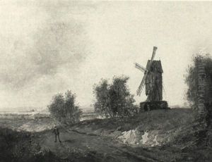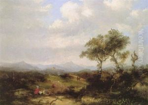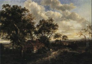 A Drover And Cow On A Path Beside A Pond And Cottages, An Extensive Hilly Landscape Beyond
