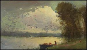 A Landscape With A Boy Fishing And Other Figures On The Banks With A House Beyond