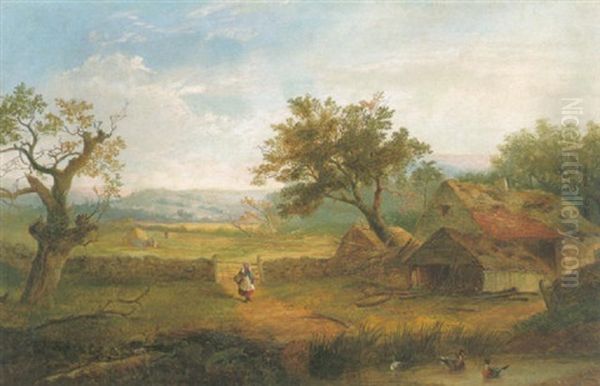 Landschaft Mit Bauernhof Und Kleiner Pilzsammlerin