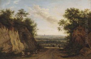 An Extensive Landscape, With Figures And Cattle In The Foregroundand A Village Beyond