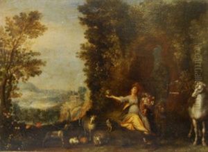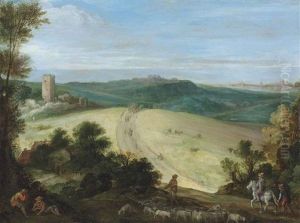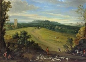 An Extensive Wooded Landscape With A Shepherd And His Flock, A Ruined Tower And City Beyond