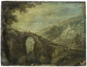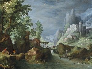 Landschaft Mit Flusslauf, Steinbrucke, Gebauden Und Figurenstaffage