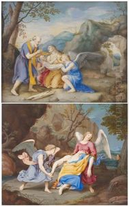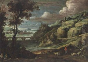 An Extensive Italianate Landscape With Shepherds Watering Their Flocks By A Stream, With Jesus And Two Disciples At Emmaus