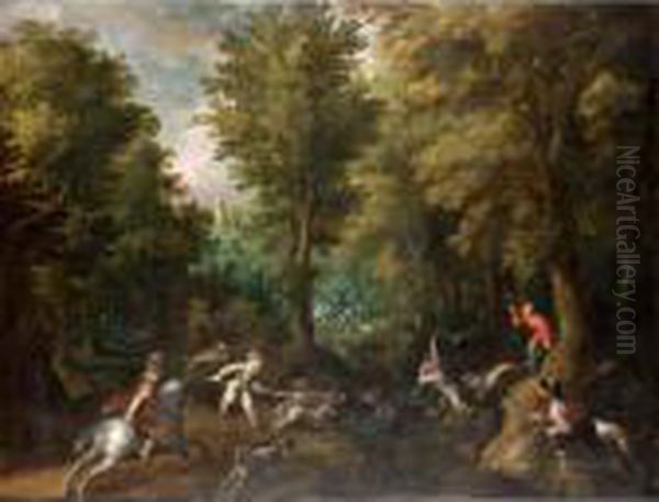 Hunters And Their Dogs Chasing A Boar In A Wooded Landscape