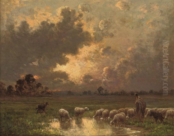 A Shepherd Watering His Flock At Dusk