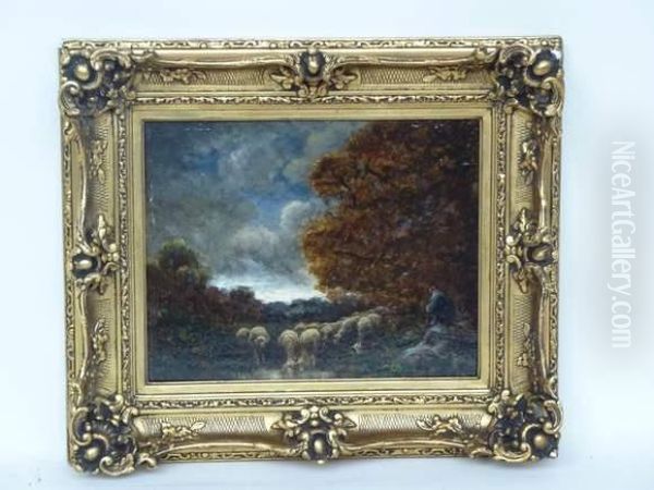 Berger Et Son Troupeau A La Mare  Oil Painting by Paul Chaigneau