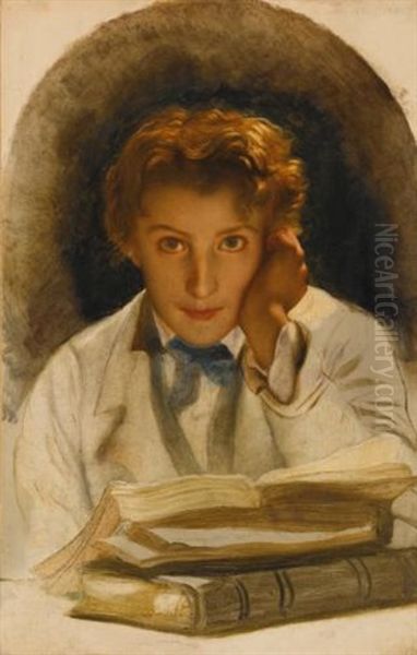 Portrait Of Joseph-carle-paul-horace Delaroche, Son Of The Artist, Half Length With A Pile Of Books Oil Painting - Paul Delaroche
