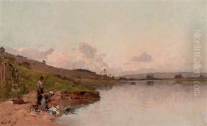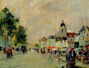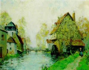 Herbsttag. Blick Uber Einen Kanal Auf Hausboote Vor Der Silhouette Einer Stadt