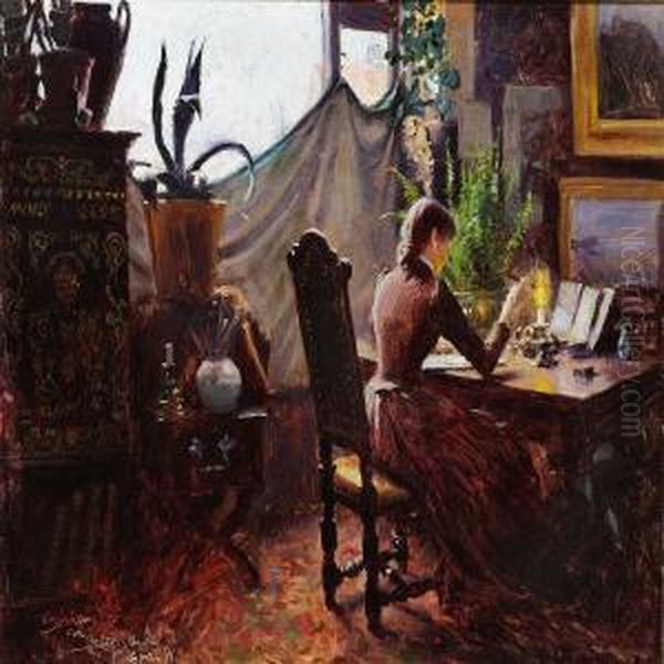 Interior With A Young Woman Sealing A Letter
