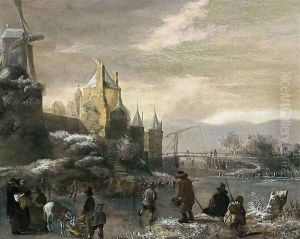 Skaters On A Frozen River By A Mill