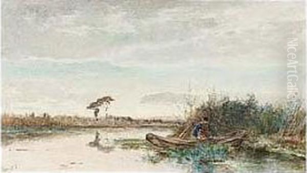 An Angler In A Polder Landscape Oil Painting by Paul Joseph Constantine Gabriel