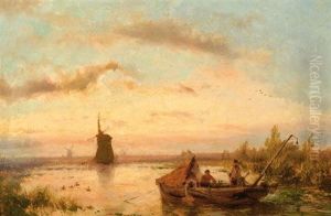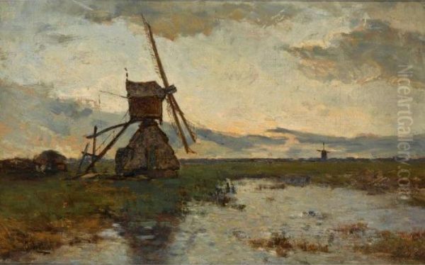 Windmills In A Polder Landscape Oil Painting by Paul Joseph Constantine Gabriel