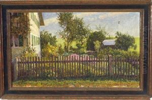 Dahlienstraus Auf Tisch Am Geoffneten Fenster Mit Blick In Den Sommerlichen Garten