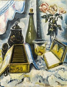 Blumenstilleben Mit Flasche, Glas Und Kuchen