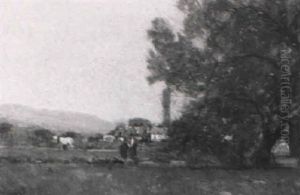 Wiesenlandschaft Mit Bauern Bei Weidenden Kuhen