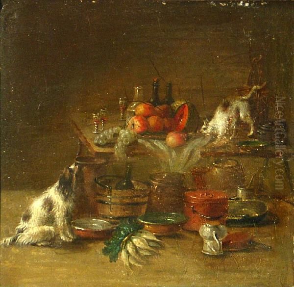 A Still Life In A Kitchen Interior With A Dogand A Cat