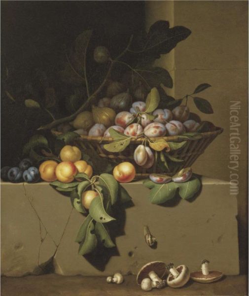 Plums And Figs In A Basket, With Apricots On A Stone Ledge, A Snail And Button Mushrooms Lower Down